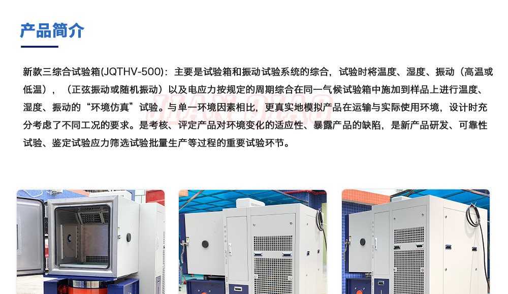 用途:新款三綜合試驗箱(JQTHV-500):主要是試驗箱和振動試驗系統(tǒng)的綜合,試驗時將溫度、濕度、振動(高溫或低溫),(正弦振動或隨機振動)以及電應力按規(guī)定的周期綜合在同一氣候試驗箱中。